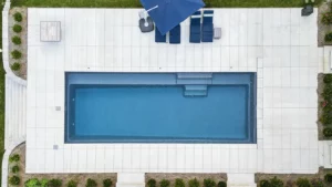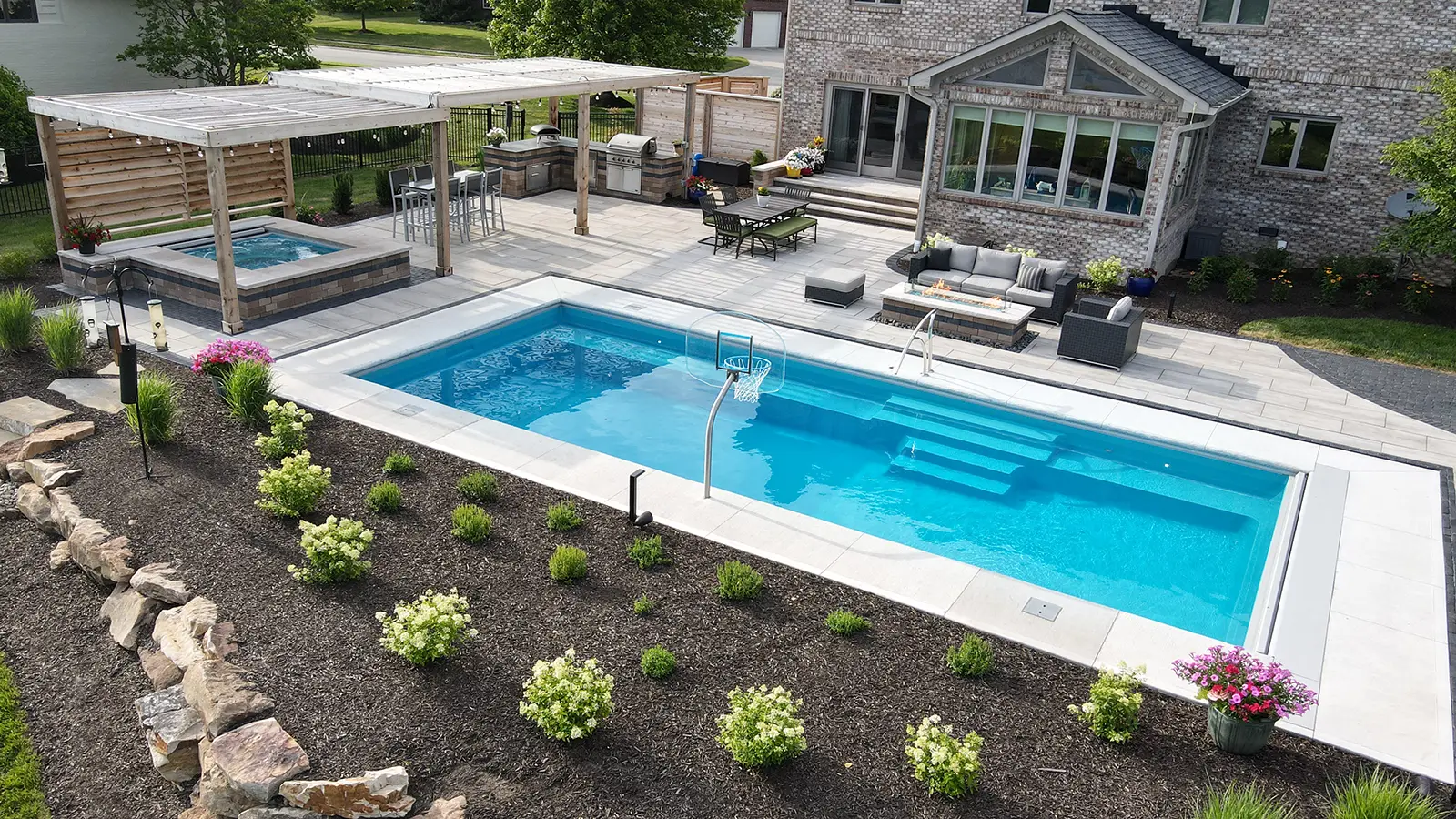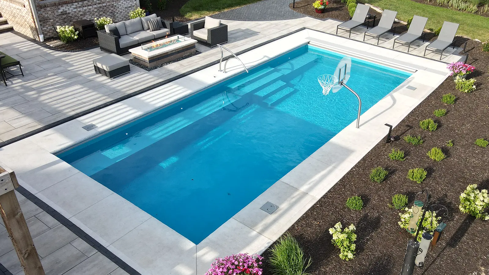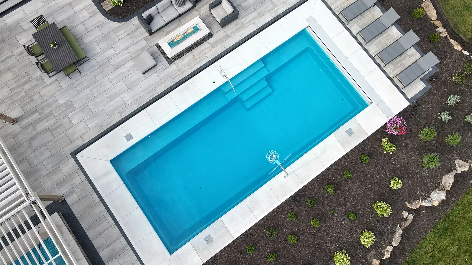 - Features a wide bench seat running the entire length of the pool