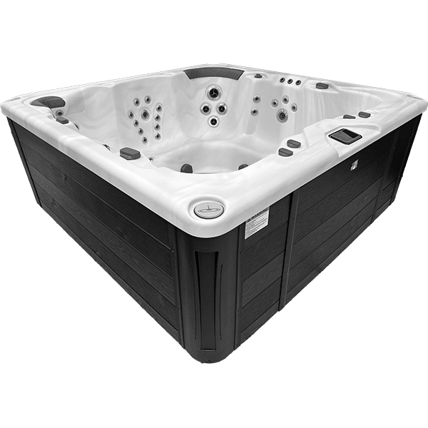 Built for efficiency, it runs on a 220V electrical system with 30/50 amp options. The acrylic-fiberglass shell comes in Sterling Silver, Sierra, or Alabaster Wave, paired with a Gray or Black cabinet and a sturdy polyethylene base for lasting durability.